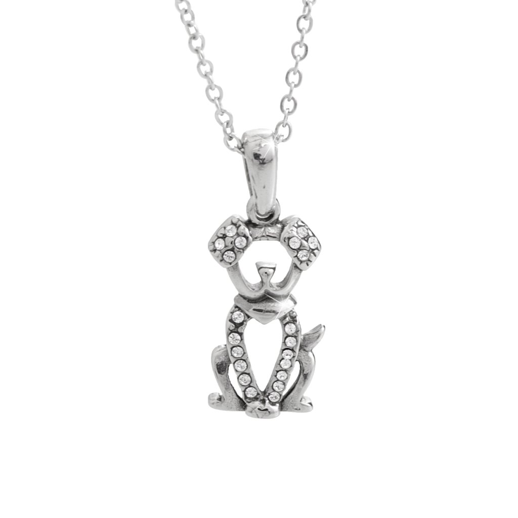 Ocelový náhrdelník ve stříbrné barvě. Náhrdelník zdobí přívěsek ve tvaru pejska, který je osázený třpytivými krystaly Swarovski.