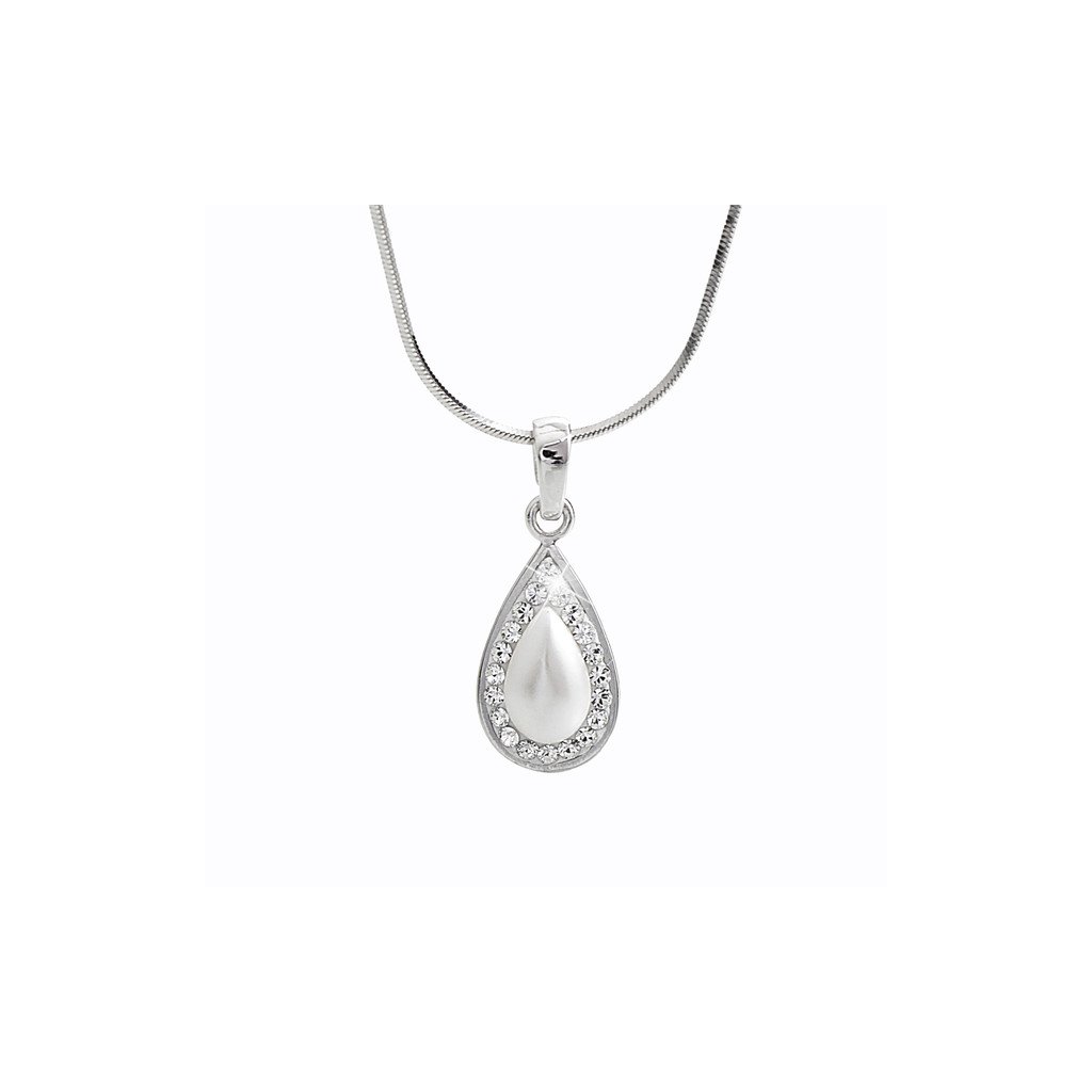 Stříbrný náhrdelník se slzovitým přívěskem. Přívěsek tvoří jeden bílý, perlový kámen uprostřed, kolem kterého jsou dokola osázeny třpytivé krystaly Swarovski.
