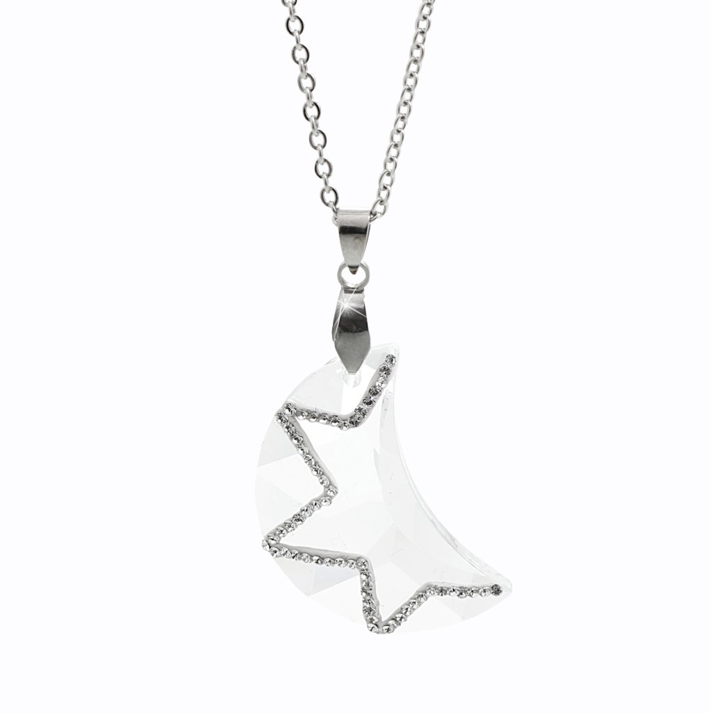 Ocelový náhrdelník ve stříbrné barvě s přívěskem krystalu. Přívěsek má tvar měsíce a je zdobený proužkem třpytivých krystalů Swarovski. Přívěsek je v bílé barvě.