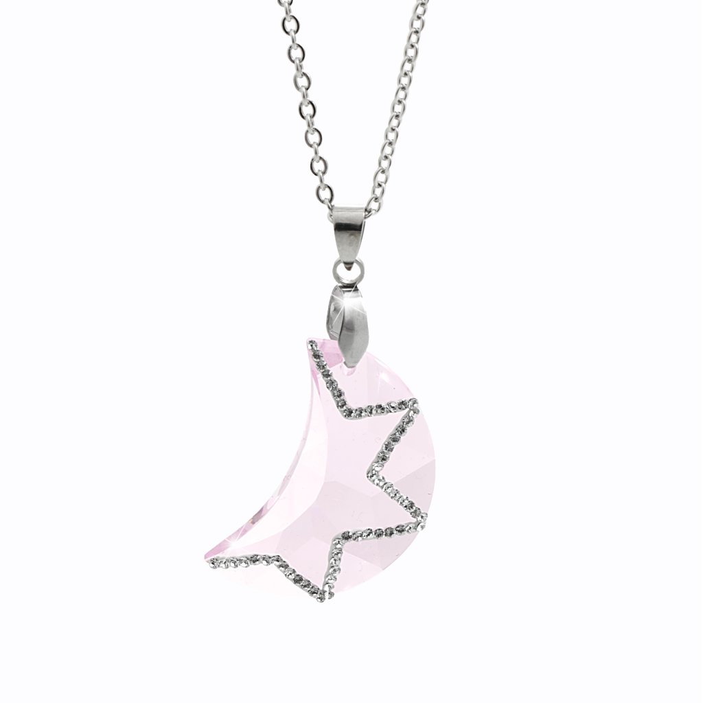 Ocelový náhrdelník ve stříbrné barvě s přívěskem krystalu. Přívěsek má tvar měsíce a je zdobený proužkem třpytivých krystalů Swarovski. Přívěsek je v růžové barvě.