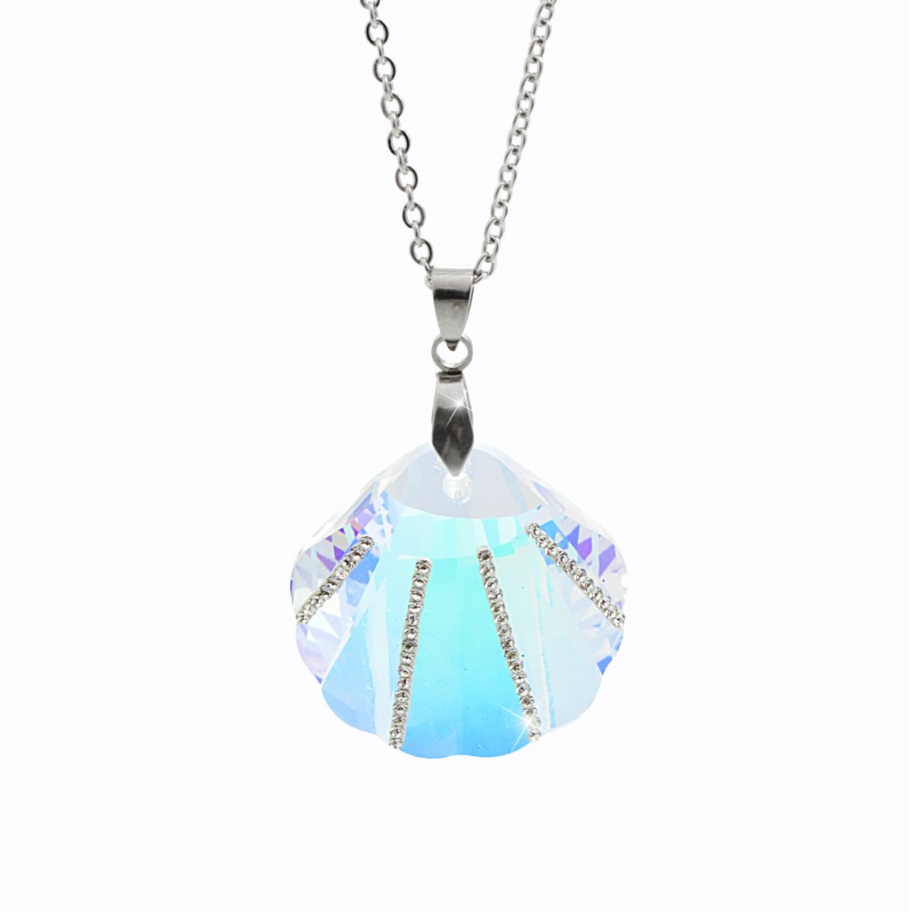 Ocelový náhrdelník ve stříbrné barvě s přívěskem krystalu. Přívěsek má tvar mušle a je zdobený proužky třpytivých krystalů Swarovski. Přívěsek je v barvě ab.