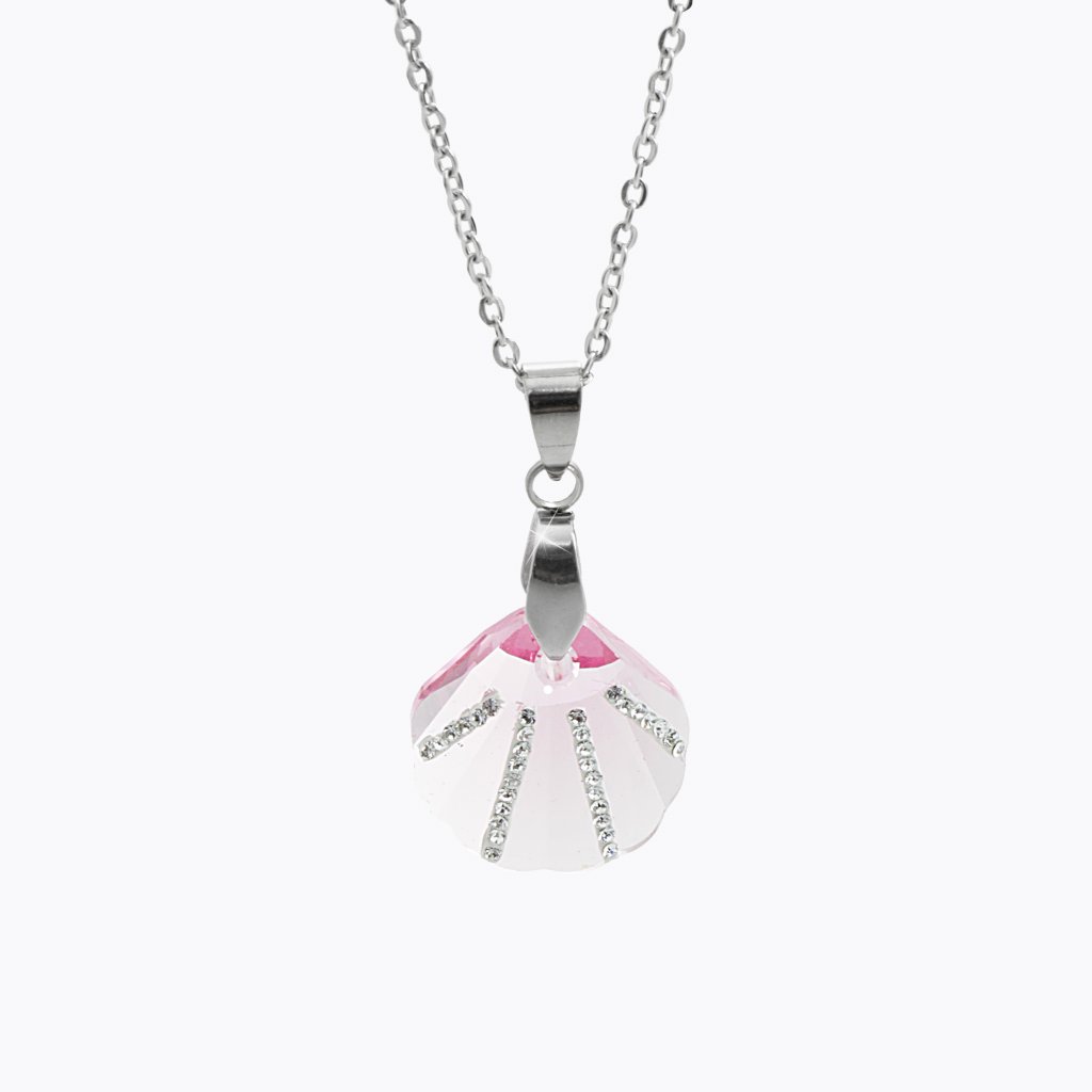 Ocelový náhrdelník ve stříbrné barvě s přívěskem krystalu. Přívěsek má tvar mušle a je zdobený proužky třpytivých krystalů Swarovski. Přívěsek je v růžové barvě .