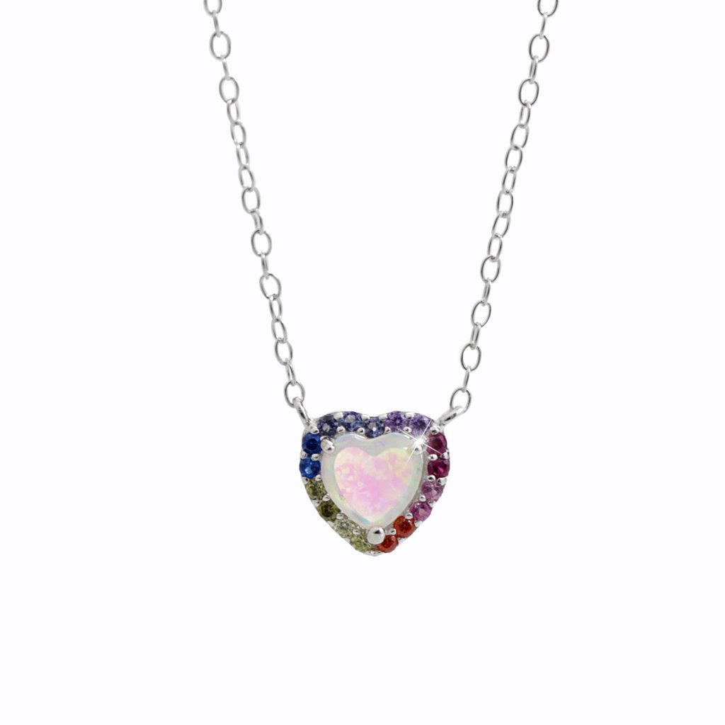 Stříbrný náhrdelník s přívěskem ve tvaru srdíčka. Prostředek přívěsku tvoří samostatný bílý, opálový kámen. Kolem něho jsou zasazeny kubické zirkony v pestrobarevném mixu.