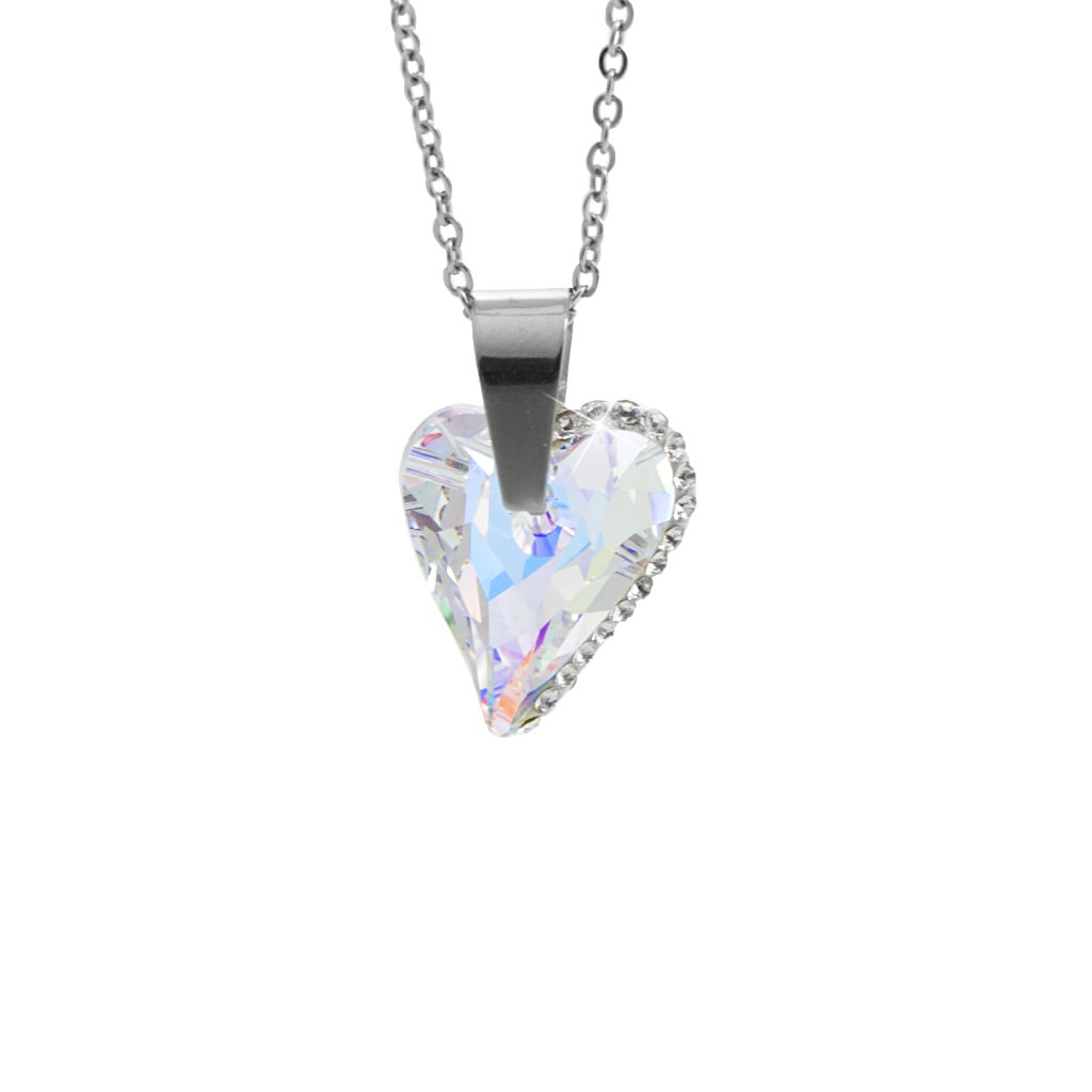 Ocelový náhrdelník ve stříbrné barvě s přívěskem krystalu. Přívěsek má tvar srdíčka a je zdobený třpytivými krystaly Swarovski, kolem půlky obvodu. Přívěsek je v barvě ab.