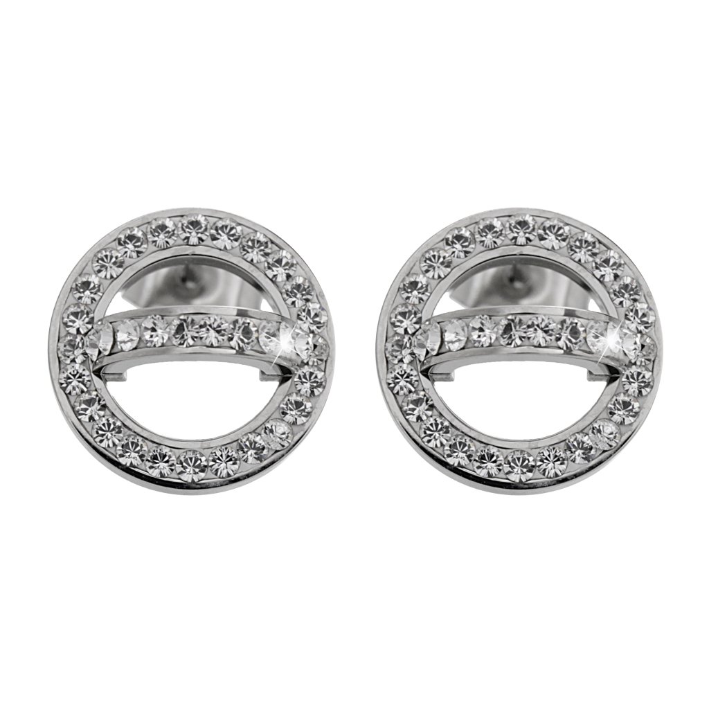 Náušnice ve stříbrné barvě. Jako povrchová úprava šperku je použito rhodium, které je známé svým vysokým leskem a odolností. Dalším důvodem použití rhodia na šperky je jeho antibakteriání a antioxidační ochrana, která brání před oxidací – černáním. Životnost šperku je ovlivněna zacházením a tělesné chemii. Náušnice ve tvaru kruhu zdobené krystaly Swarovski.