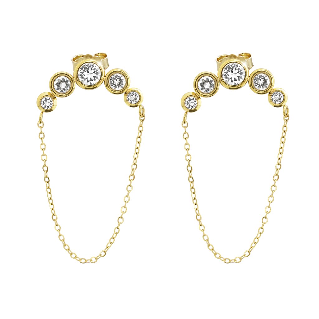 Zlaté náušnice z chirurgické oceli. Chirurgická ocel je bezesporu velice oblíbený materiál, který je ve šperkařství hojně používaný. Tento materiál je velice kvalitní a odolný a má hned několik výhod. Nejvíce oceníte, že nečerná ani nezpůsobuje alergické reakce, takže je pro lidi s citlivostí na kovy jednou z mála možností, jak si dopřát krásný šperk. Náušnice zdobené visacím řetízkem. V horní části jsou osázené krystaly Swarovski.
