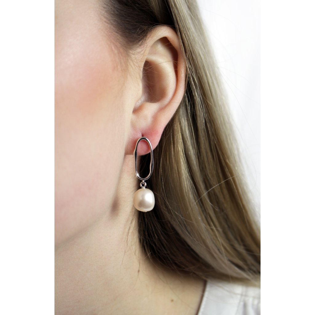 Náušnice na kterých dominuje bílá říční perla, Která se pohupuje na nepravidelném kovovém oválu.
