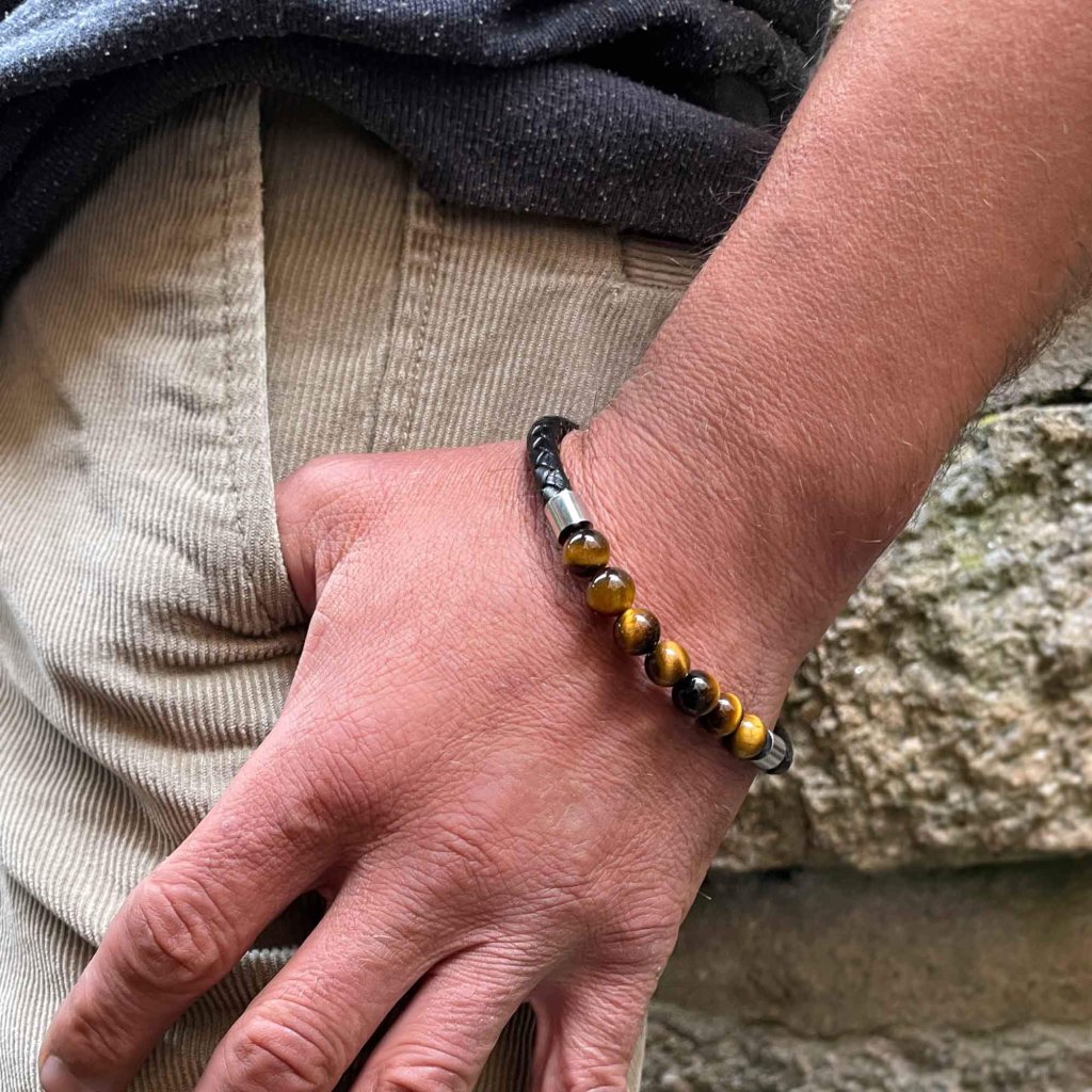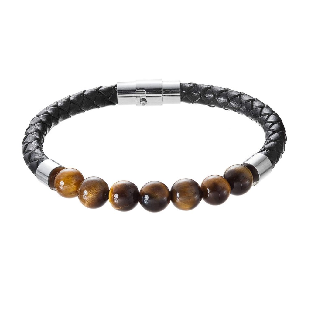 Náramek v černé barvě je vyroben z koženkového zapleteného pásku a kamenů tygřího oka. Tygří oko posiluje vůli a koncentraci, zklidňuje nervy a napomáhá samostatnému rozhodování.