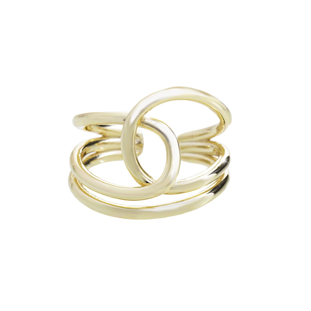 Stříbrný prsten zlaté barvy ve tvaru propojeného oblouku.