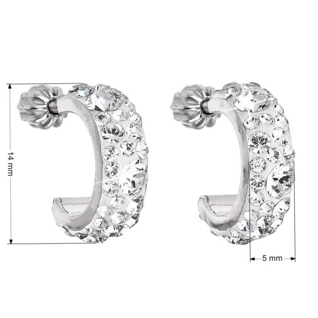 Náušnice ve tvaru půlkruhu jsou vyrobeny ze stříbra o ryzosti 925/1000 s povrchovou úpravou rhodiem a jsou zdobeny mnoha Swarovski krystaly v bílé barvě.